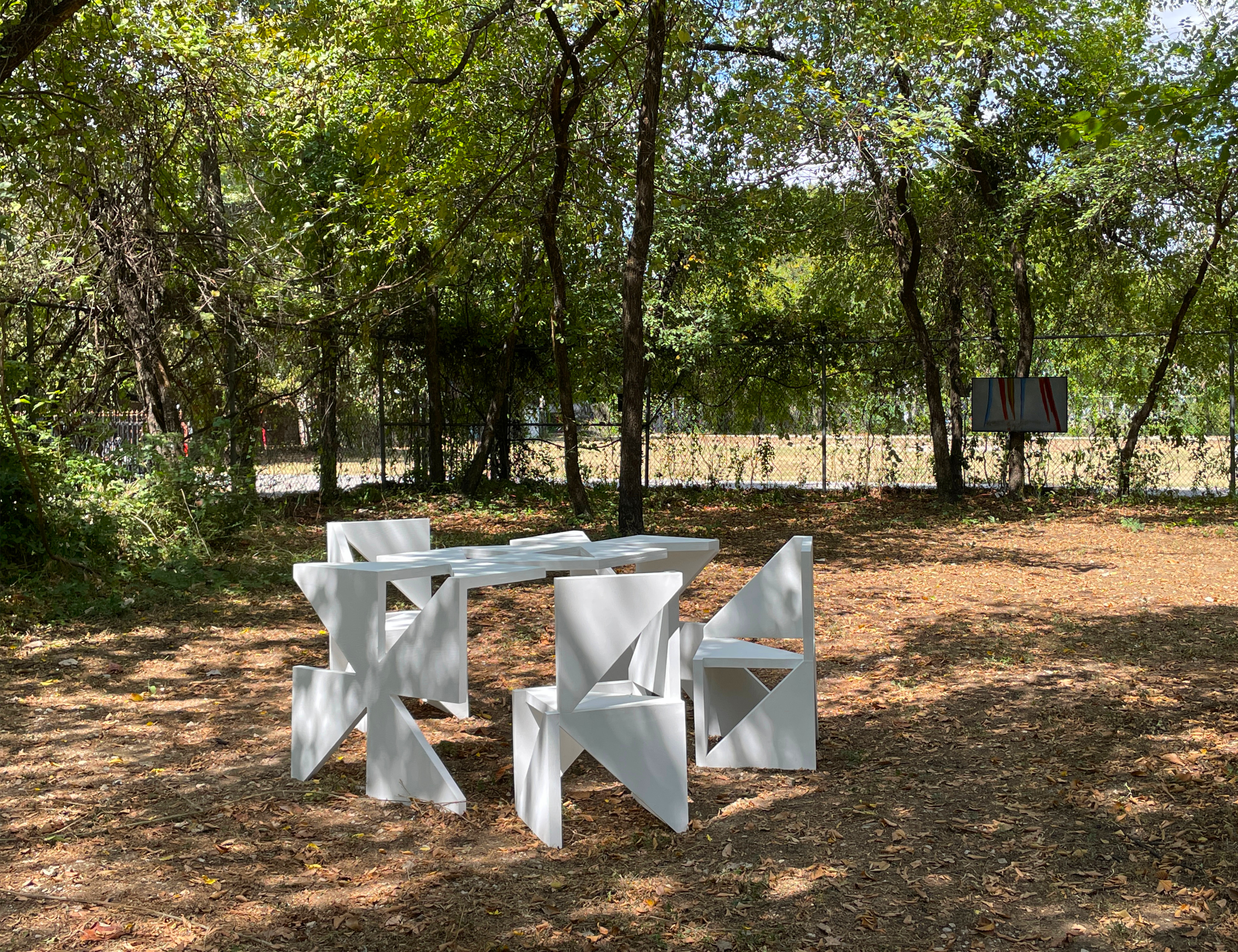 The exhibition’s title, Nearly Natural, is appropriated from the American company by the same name—a vendor of artificial, silk trees and hedges. The titling reflects the contemporary status of the landscape as a massively collaborative, mediated plain where a multitude of disparate technologies have made marks, sculpting its meaning and exchanging its elements. The presented artists express understandings of the landscape that question the interrelationships between technologies of illusion and the act of inhabiting a site. The exhibition unfolds with interplay between the digital and the physical; visibility and invisibility; tourism and residency; and the historical and personal. Andreas Angelidakis (Greek, born 1968) is an artist and architect working in Athens, Greece. Angelidakis’s practice addresses the ever-narrowing divide between the our experiences of digital and physical space. Included is his 2006 work Philosophy Table and Chairs, reproduced in Texas for outdoor display. The furniture set is based on a browser-based work by artist Japanese performance artist Mai Ueda. Angelidakis proposes that the shift of digitally-born images to the physical world are contemporary ruins. Gabriel Cohen (American, born 1995) is an artist, author and curator living and working in Los Angeles, CA. Cohen’s sculptural works investigate the processes of myth-building particularly how it relates to materials and urban infrastructure. Here, he exhibits a pendlum-cum-radio tower. Constructed out of finished plywood, the tower’s function is inverted--acting as a receiver rather than a transmitter. The broadcast it receives and amplifies is a speech by American Footballer, Ray Guy in which he recounts a rambling anecdote of atmospheric conditions and their effects on his radio as a child. The sculpture is a waypoint where the two invisible forces of atmosphere and radio waves meet. Julien Creuzet (French-Caribbean, born 1986) lives and works in Paris, France. Creuzet reconsiders the history of his native Caribbean by way of landscape. The narratives presented in his works bend space and time, inextricably linking disparate geographies through poetics. His work frequently references the landscape of the ocean—its surface and its depths—as the site of cultural trauma and erasure. Reflecting on the works of Aimé Césaire and Édouard Glissant his work blends fiction with investigations of regional and diasporic histories. Creuzet’s video is composed of seemingly infinite scrolling illustrations of feathers, rendered in a manner reminiscent of 18th Century European ethnography—colonial mythology all the way down. Ricardo Morales-Hernández (American, born 1984) lives and works in San Juan, Puerto Rico. Morales-Hernández exhibits his first architectural construction—a closed circle of blue construction tarps and a single canvas. In artist-made charcoal on both recto and verso, the canvas depicts imaginary landscapes which give a first impression of either text or musical notation—both references welcomed by the artist. His work addresses the touristic language enshrouding his native Puerto Rico, “tropical as paradisiacal,” as a semiotic technology. Produced in his outdoor studio, the canvas holds both the marks of the artist, as well as the direct interventions of the landscape itself. It survived two major hurricanes in 2017: Irma and Maria. Letha Wilson (American, born 1976) is a conceptual artist working at the intersection of sculpture and photography. She is based between New York City and the Hudson Valley, NY. She contributes a temporary outdoor construction--a white, gallery wall physically intersecting two of the site’s resident trees. Frontally, the work appears as a white wall with the tree’s branches penetrating its surface. The siting of Wilson’s intervention attends not only to the flora’s interaction with her artificial construction, but to the light, the shadows cast throughout the day, suggesting a photographic, momentary interpretation of experience. |