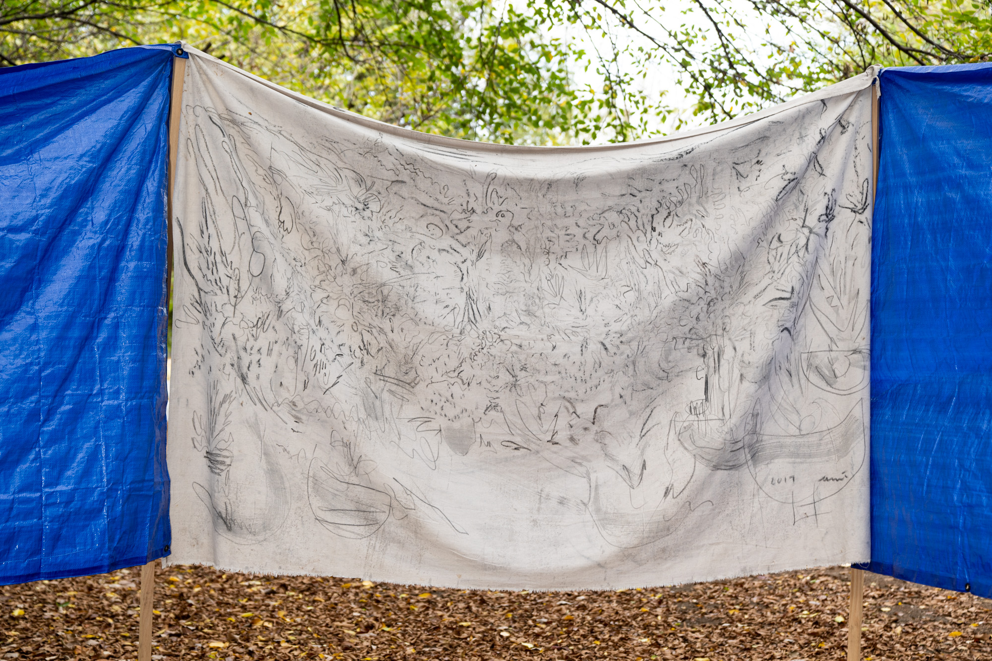Ricardo Morales-Hernández Forced Autumn I -SDG-017-004, 2017/2021 Artist-made charcoal on canvas drop cloth, tarps, wood Structure: 22’ in diameter Painting: 67” x 108” |